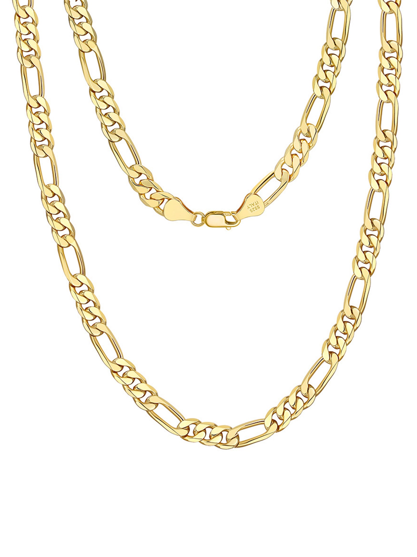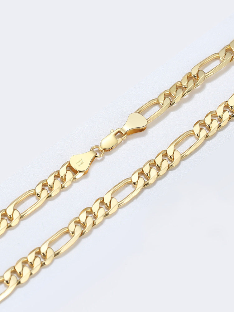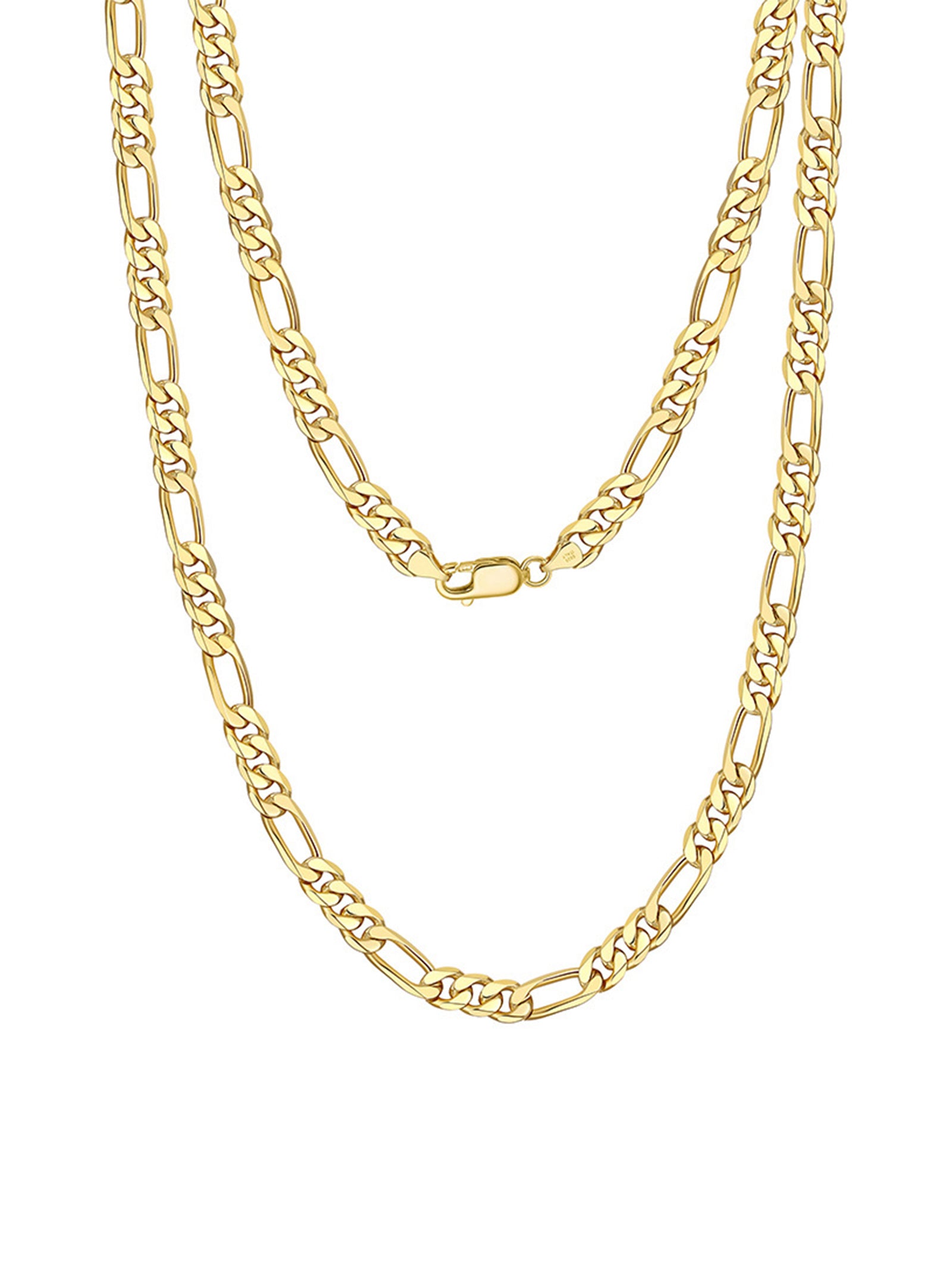 This Figaro Chain Necklace is crafted from 925 sterling silver and enriched with a warm 18k gold plating. It strikes the perfect balance between classic appeal and contemporary flair. The varied link sizes create a rhythmic, eye-catching texture that stands out for its artistry and elegance.