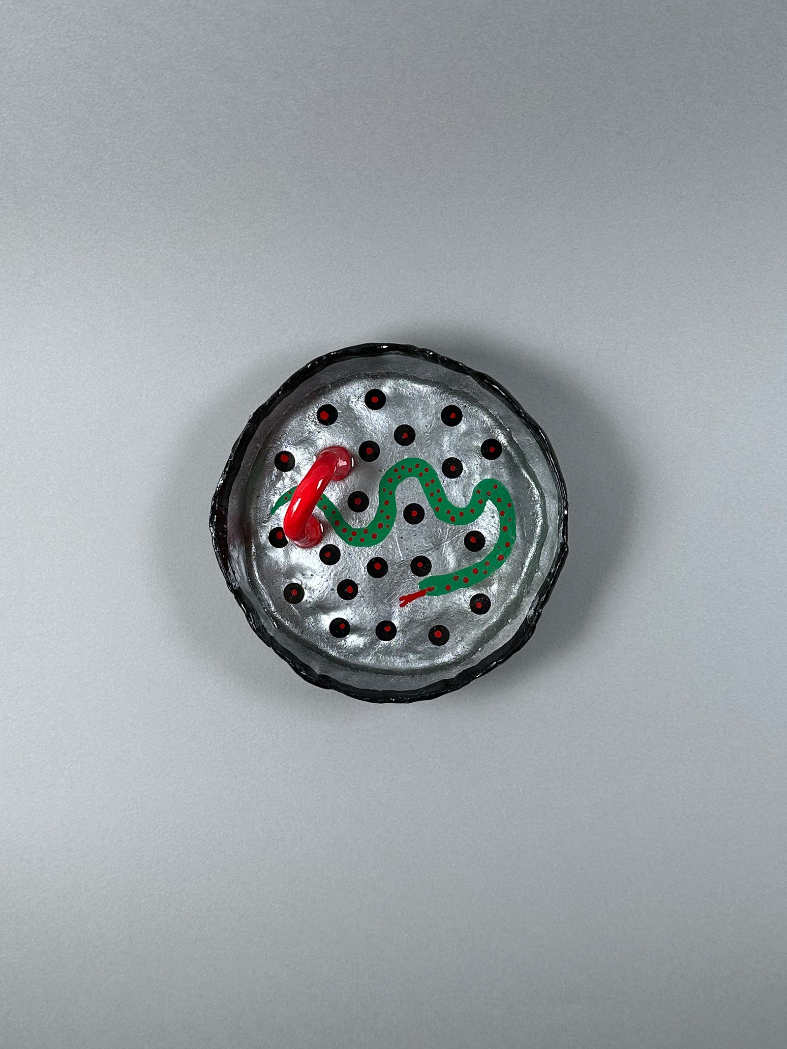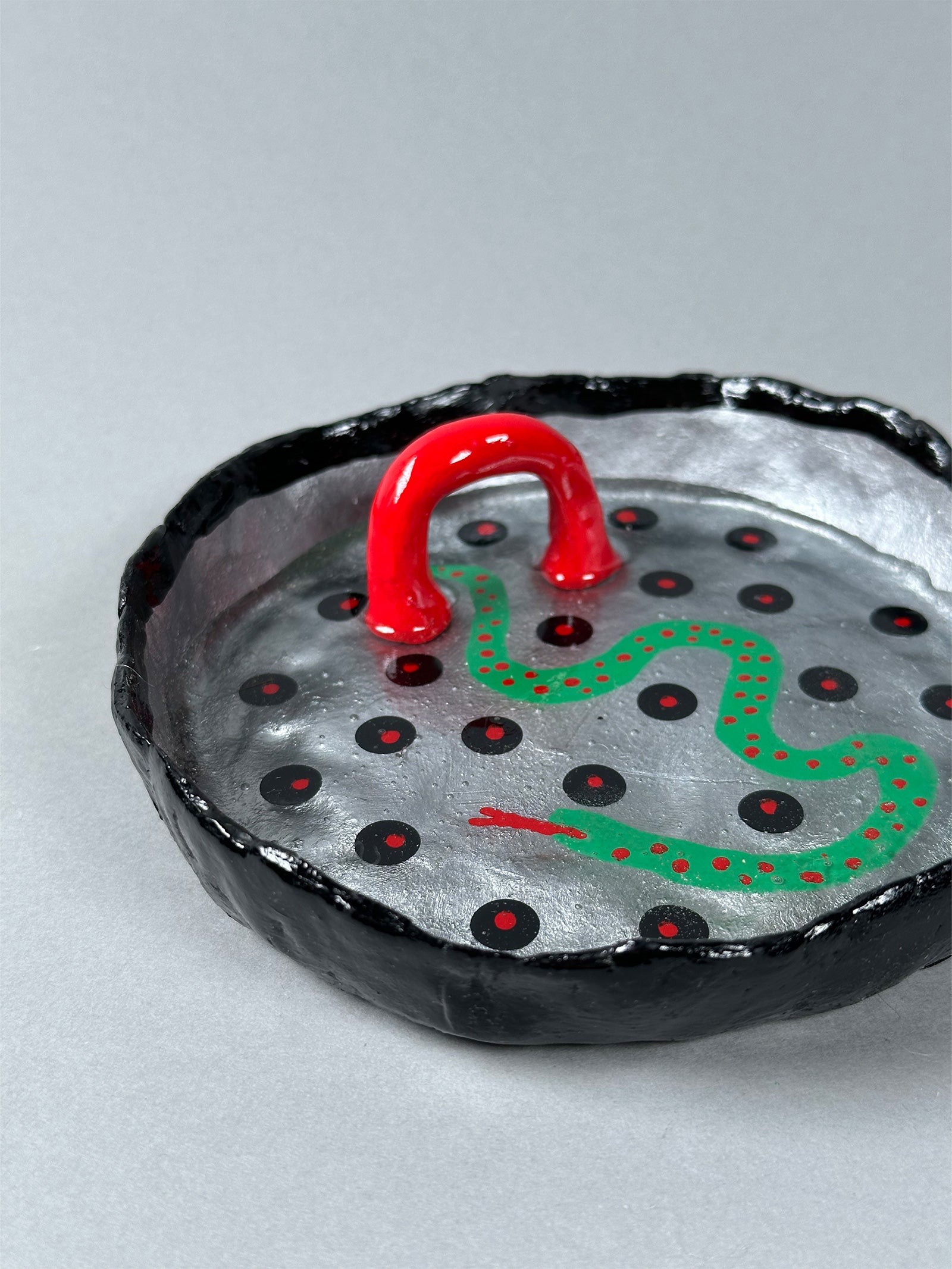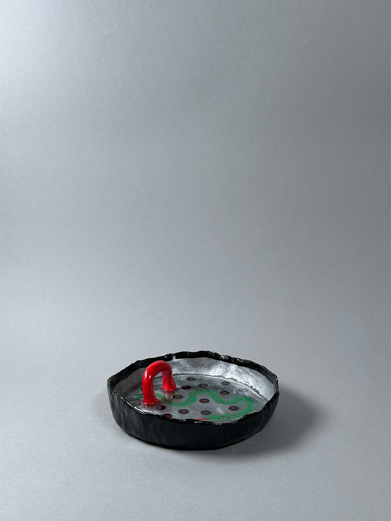 This tray is hand-crafted and hand-painted from rustic clay with original texture and raw edge. Coated with Japanese resin on top, it is waterproof and heat-resistant. This versatile piece is perfect for holding keys, jewellery, and trinkets, and can be used as an ashtray or a decorative object.
